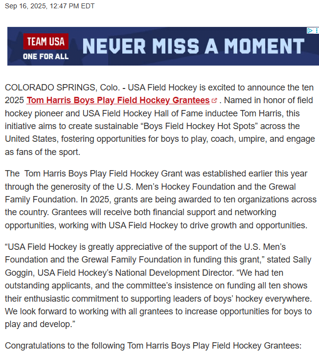 We are beyond excited and thankful to announce that we have been selected to be a part of the 2025 Tom Harris Boys Play Field Hockey Grant Cohort. We are thankful to USA Field Hockey for this opportunity and look forward to working together in growing one of the greatest games right here in the Capital District. With allowing opportunities for boys to participate as well, the game has room to grow even further!